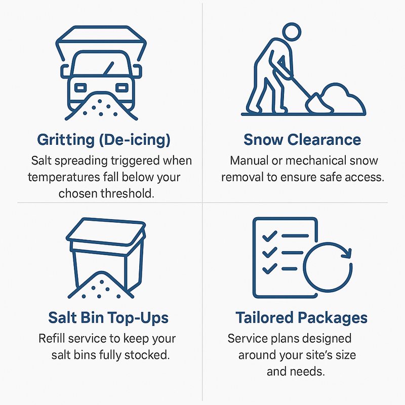 At I-Grit, our services are designed to provide complete winter risk management for your business or property. Whether you need one-off support or a fully managed winter plan, we deliver efficient, timely, and tailored solutions that keep your site safe, compliant, and operational – no matter the weather.
